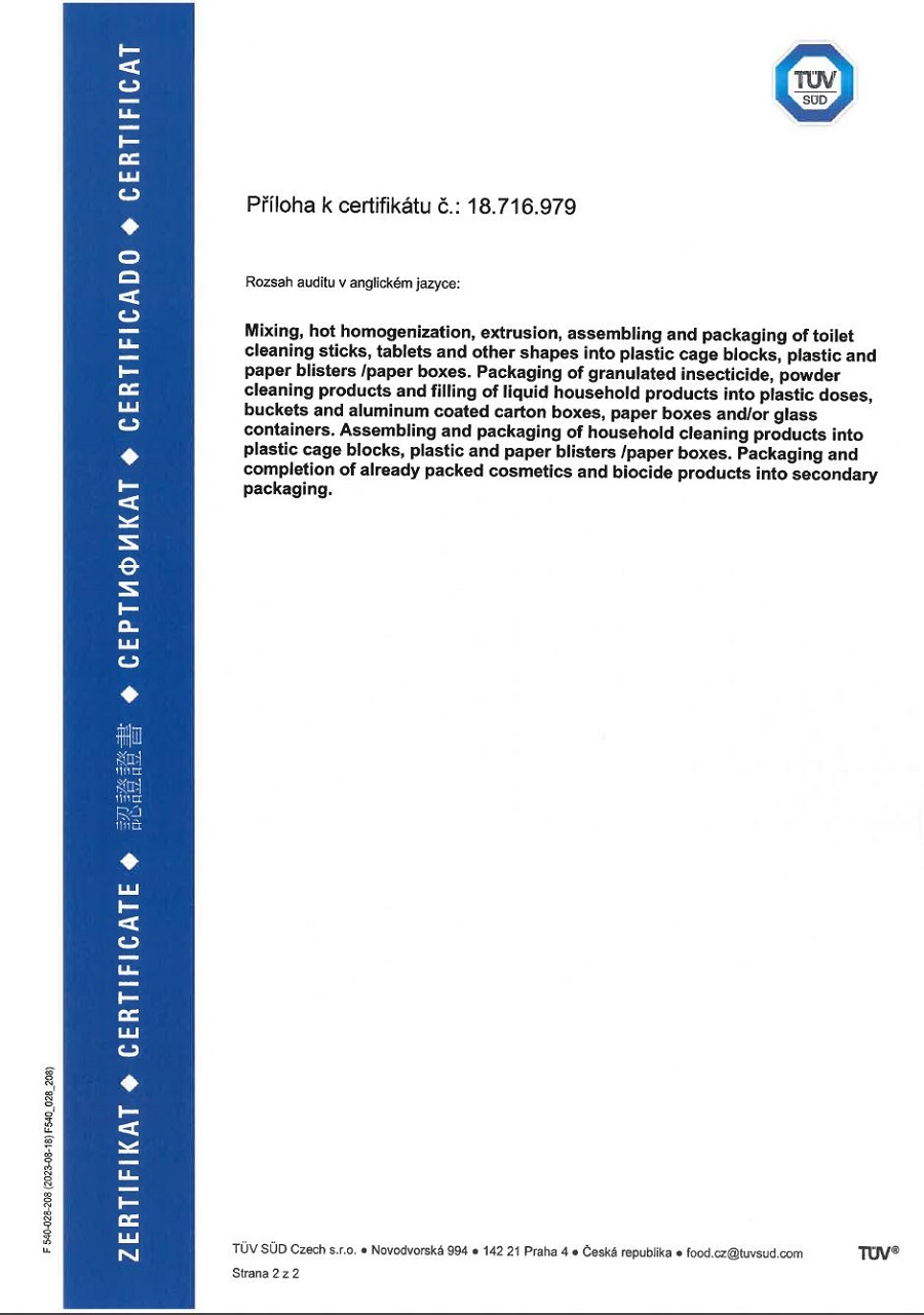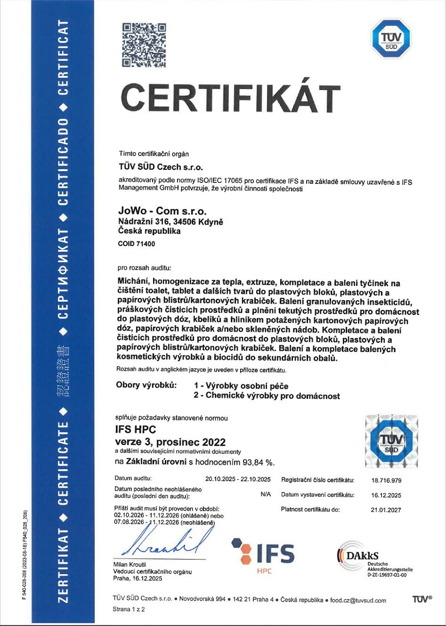Společnost JoWo – Com s.r.o. byla ve dnech 06./07.12.2023 úspěšně certifikována organizací TÜV-Nord a stala se držitelem certifikátu IFS-HPC (International Featured Standard – Household and Personal Care Products).